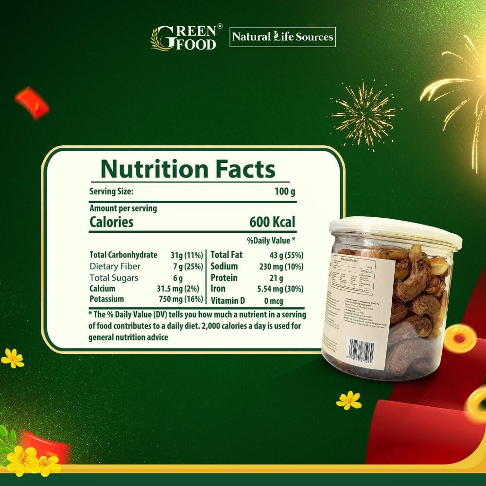 Nguyên liệu 100% hạt điều Việt Nam – tuyển chọn từ vùng nguyên liệu sạch, chất lượng cao.