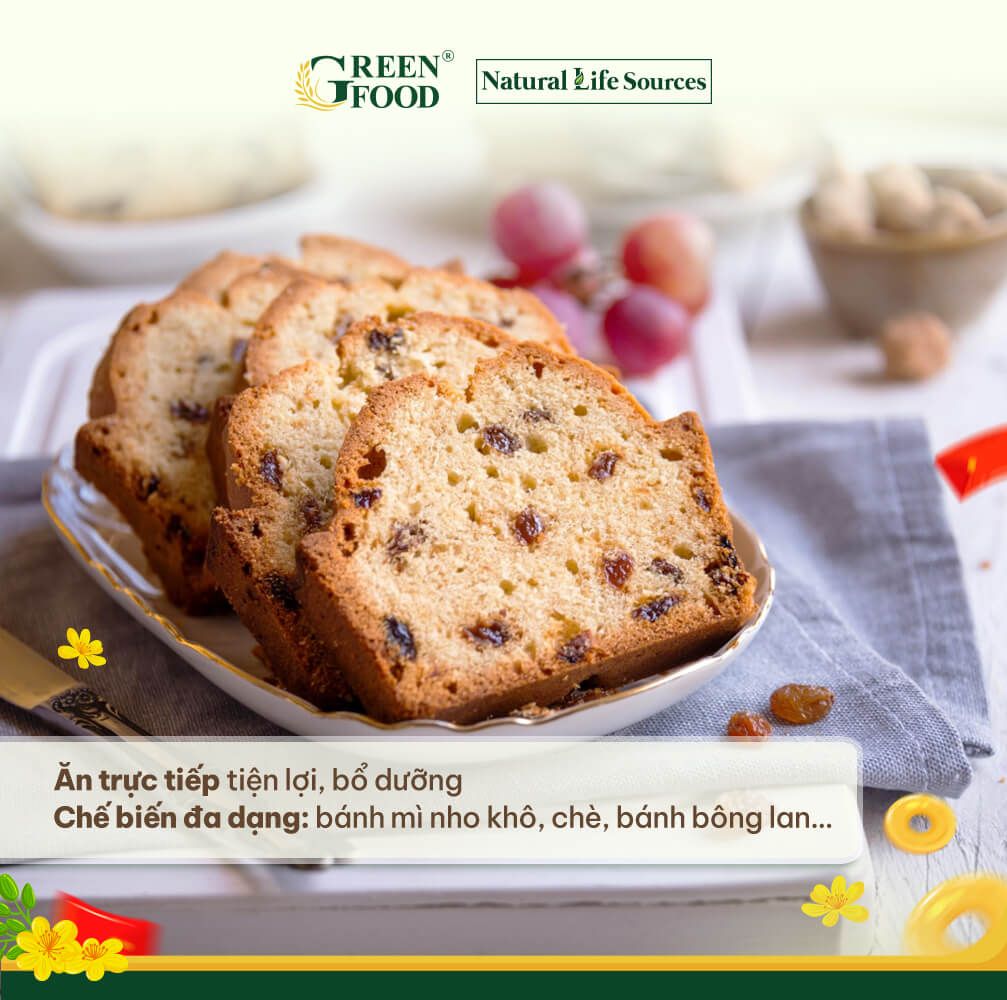 Nho khô giàu glucose và fructose – nguồn năng lượng tự nhiên lành mạnh cho cơ thể.