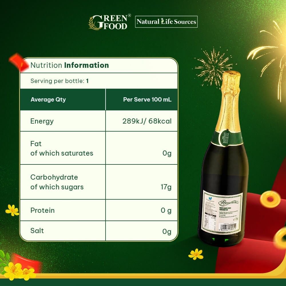 Thành phần: Nước ép nho trắng, CO2 thực phẩm, KHÔNG CỒN