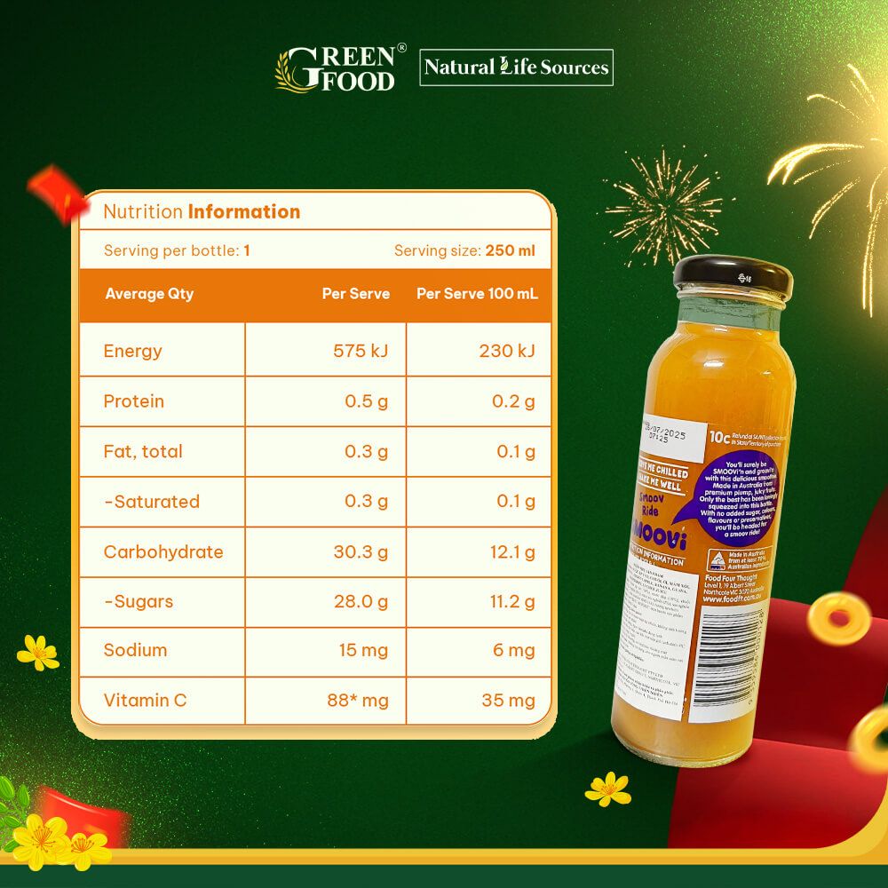 Với hương vị thơm ngon tự nhiên, Smoovi kích thích vị giác trong từng ngụm bạn thưởng thức. Đặc biệt, Smoovi KHÔNG THÊM NƯỚC, KHÔNG ĐƯỜNG, và KHÔNG CÓ THÀNH PHẦN NHÂN TẠO. Khi được ướp lạnh, Smoovi trở thành một thức uống mát lạnh, giải khát và tốt cho sức khỏe của bạn, như một món quà tình yêu thương từ Úc.